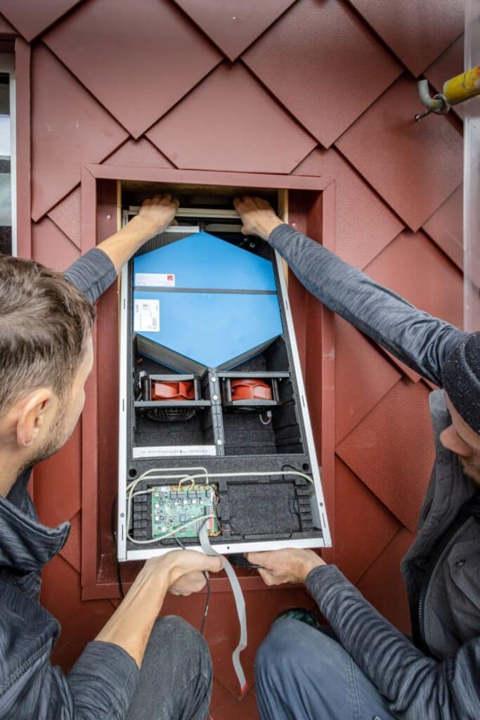 Der Wohnungsgenossenschaft lag nicht nur am Herzen, dass die Mietparteien keiner finanziellen Mehrbelastung ausgesetzt werden, sondern während des kompletten Sanierungszeitraums in ihren Wohnungen bleiben können. Um den operativen Eingriff in die Gebäudehülle so wenig invasiv wie möglich zu gestalten, entschied man sich dazu, die neue Fassade mit einer Dämmung von ca. 45 cm und inklusive vormontierter Fenster und Türen komplett vorzufertigen und im nächsten Schritt damit das Bestandsgebäude einzukleiden. Diese Vorgehensweise erforderte auch, dass die Lüftungsgeräte sowie die Luftverteilung bereits im Vorhinein in die neue Fassade integriert werden. „Dafür haben wir in der Werkstatt von Korona Holzbau gemeinsam an der optimalen Lösung getüftelt“, berichtet Marcus Bieleit. Zur Veranschaulichung wurde dort erst mit Modellen gearbeitet, bis die richtigen Maße und die perfekte Auslegung feststanden. Dann fertigte das Holzbauunternehmen die Elemente der neuen Außenfassade und setzte dabei bereits bauseits die Lüftungskomponenten ein, sodass auf der Baustelle lediglich Kernlochbohrungen und finale Installationsschritte vorgenommen werden mussten.