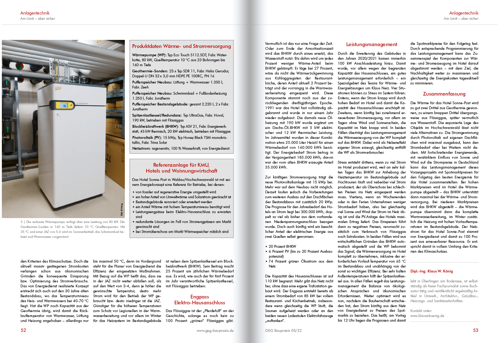 Im Zuge einer Erweiterung und Modernisierung ging es raus aus der Erdölverbrennung, rein in die Geothermie. Die Wärmeversorgung ist nach dem ersten Schritt zu 70 Prozent regenerativ, aber am Limit. Mehr geht auf dem eigenen Grundstück nicht. Die Stromversorgung aus dem Netz ist zu 100 Prozent regenerativ. Doch der Hausanschluss ist begrenzt auf 110 kW. Sicherheit bringt in dieser Situation das automatische Energiemanagement – und ein BHKW sowie ein Spitzenlastkessel, die beide noch mit Flüssiggas betrieben werden müssen, bis entsprechende Geräte für Wasserstoff verfügbar sind. Der Ort dieses Vorzeigeprojekts liegt zwischen Hochschwarzwald und Hochrhein, im äußersten Südwesten Deutschlands: Das Drei-Sterne-Superior-Hotel Sonne-Post. Der Familienbetrieb mit über 150 Jahren Tradition besteht neben den 25 Hotelzimmern und vier externen Ferienwohnungen aus Restaurant/ Küche sowie Schwimmbad/Sauna. Die abgeschiedene Lage im ländlichen Bergdorf Waldau ermöglicht ganzjährig Regeneration, Entspannung, Ferien in der Natur. Das umgesetzte Energiekonzept ist übertragbar auf andere Regionen, insbesondere auf kleine und mittlere Unternehmen (KMU).